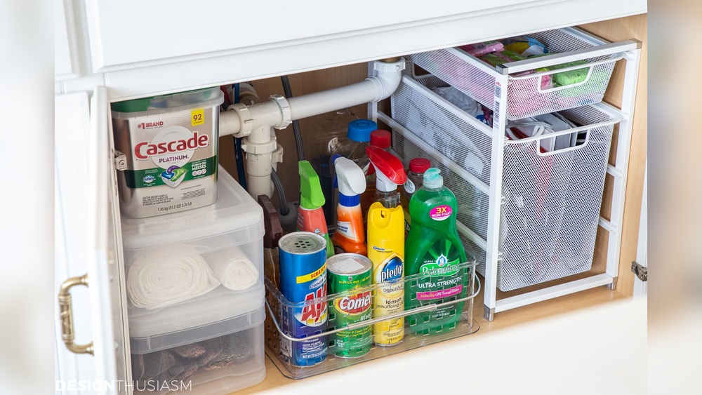 Under-sink shelves add extra storage space. They use the empty area below the sink. These shelves hold cleaning sprays and sponges. They keep items off the cabinet floor. Easy to install and adjust to fit.